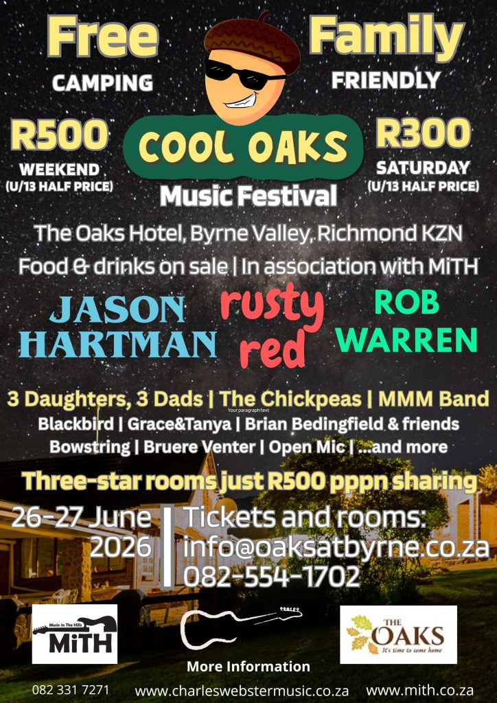 Escape to music and magic at the Cool Oaks Acoustic Festival (26–27 June 2026, The Oaks Hotel, Byrne Valley, Richmond KZN)! 🎶🌿In association with MiTH (Music In The Hills). Tickets & rooms: info@oaksatbyrne.co.za | 082 554 1702